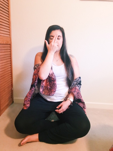 Next, use your dominant hand to hover in front of your nose. Pinch off your right nostril and inhale on the left nostril. At the peak of the breath, pinch off both sides, then exhale through the left nostril.
